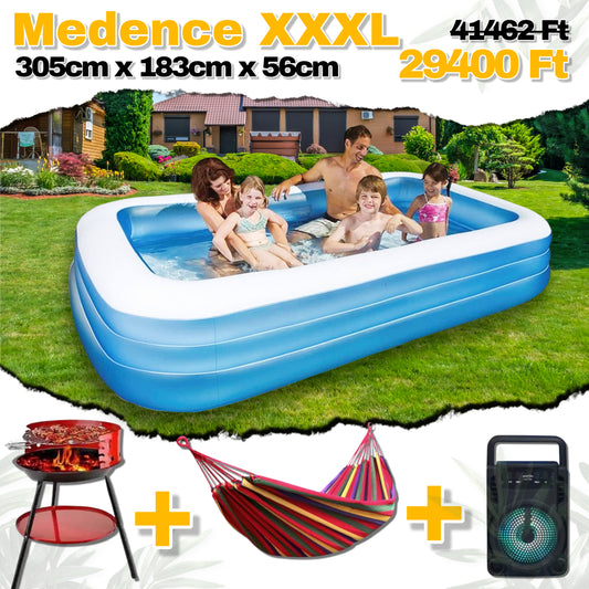4 az 1-ben ajánlat: medence XXXL 305 cm x 183 cm x 56 cm + hordozható faszén grill + függőágy + hordozható vezeték nélküli hangszóró
