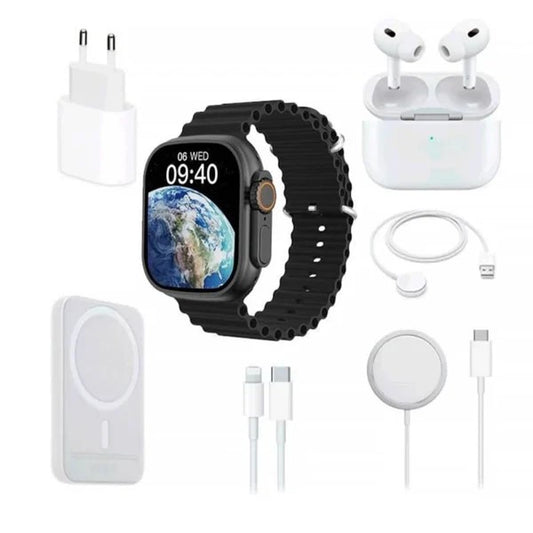 Teljes készlet Smartwatch X8 2", vezeték nélküli in-ear fülhallgatókkal, töltővel, kábelekkel, külső akkumulátorral - 8 az 1-ben