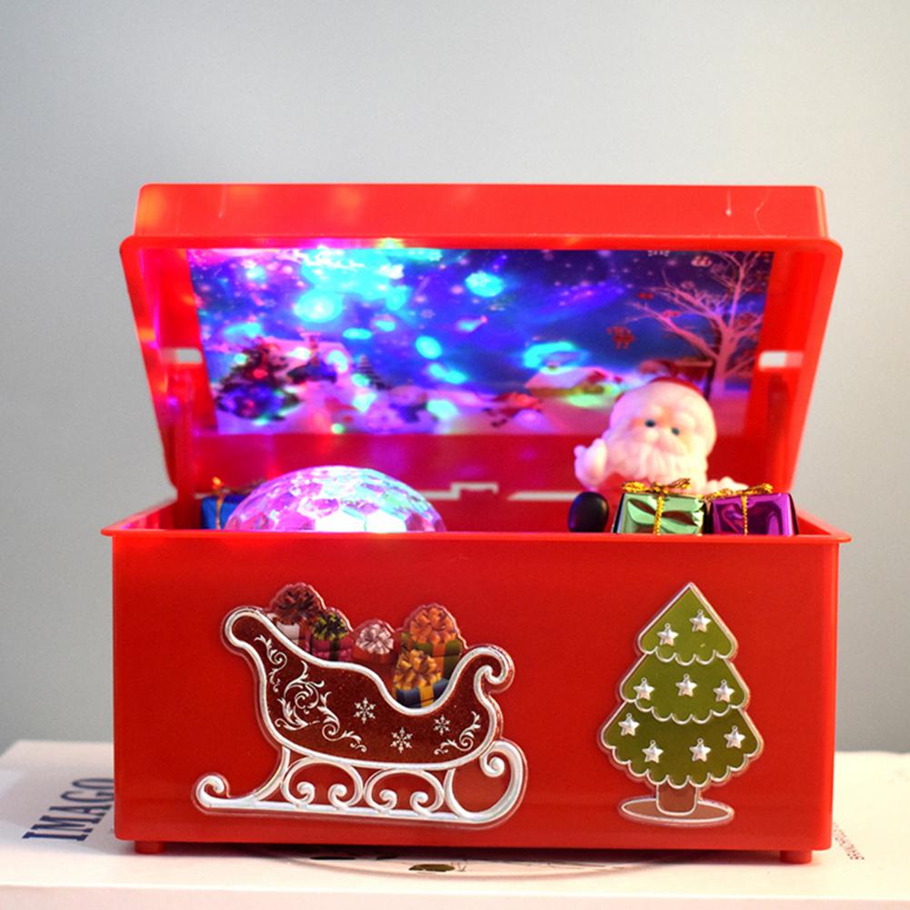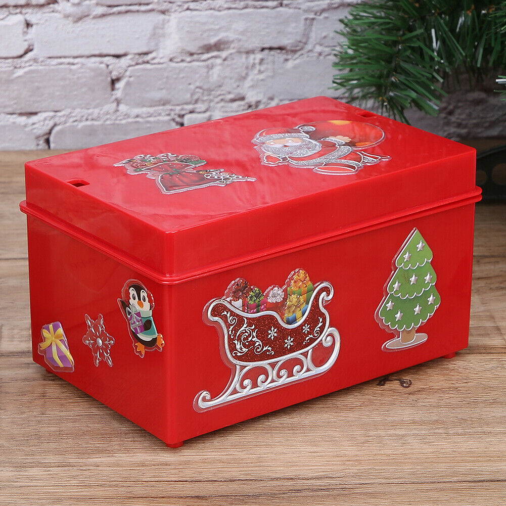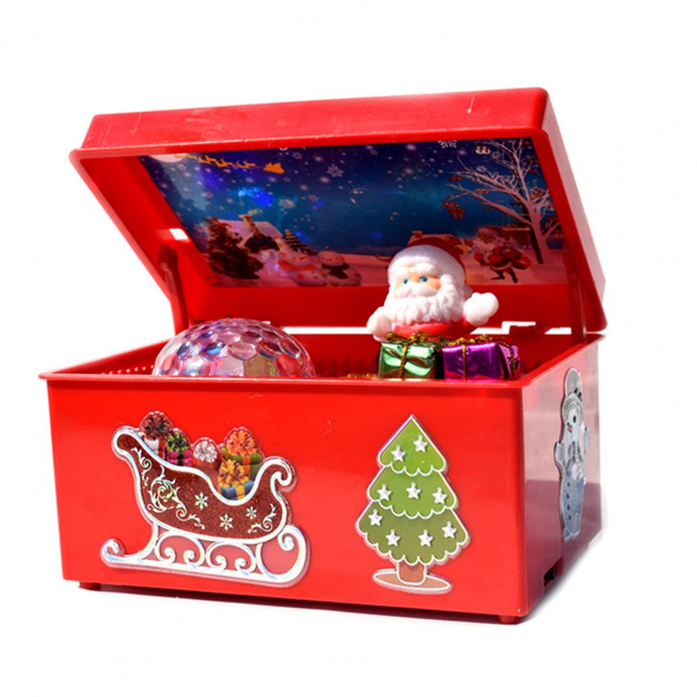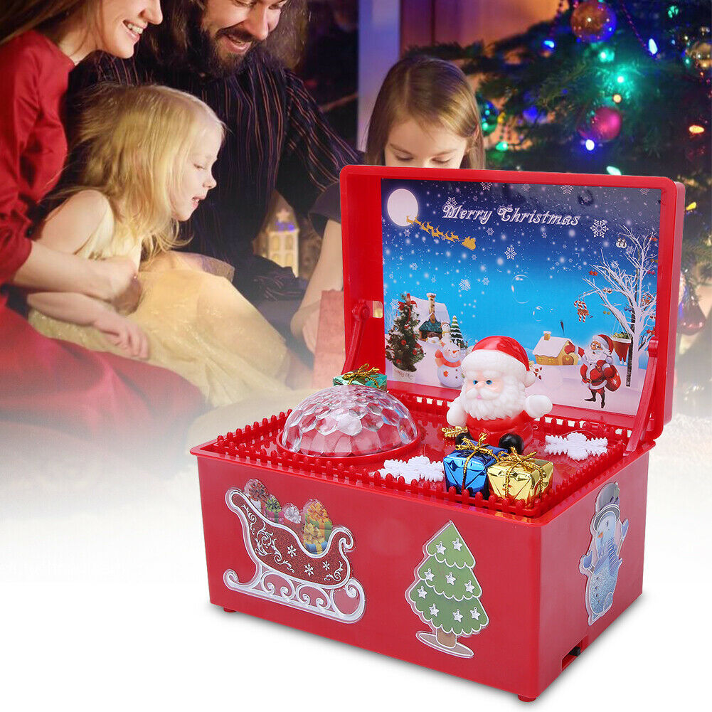 Zenedoboz karácsonyi dalokkal, diszkóbállal és táncoló Mikulásval. A doboz automatikus mechanizmussal rendelkezik, így a fedél bekapcsoláskor magától záródik és nyílik.