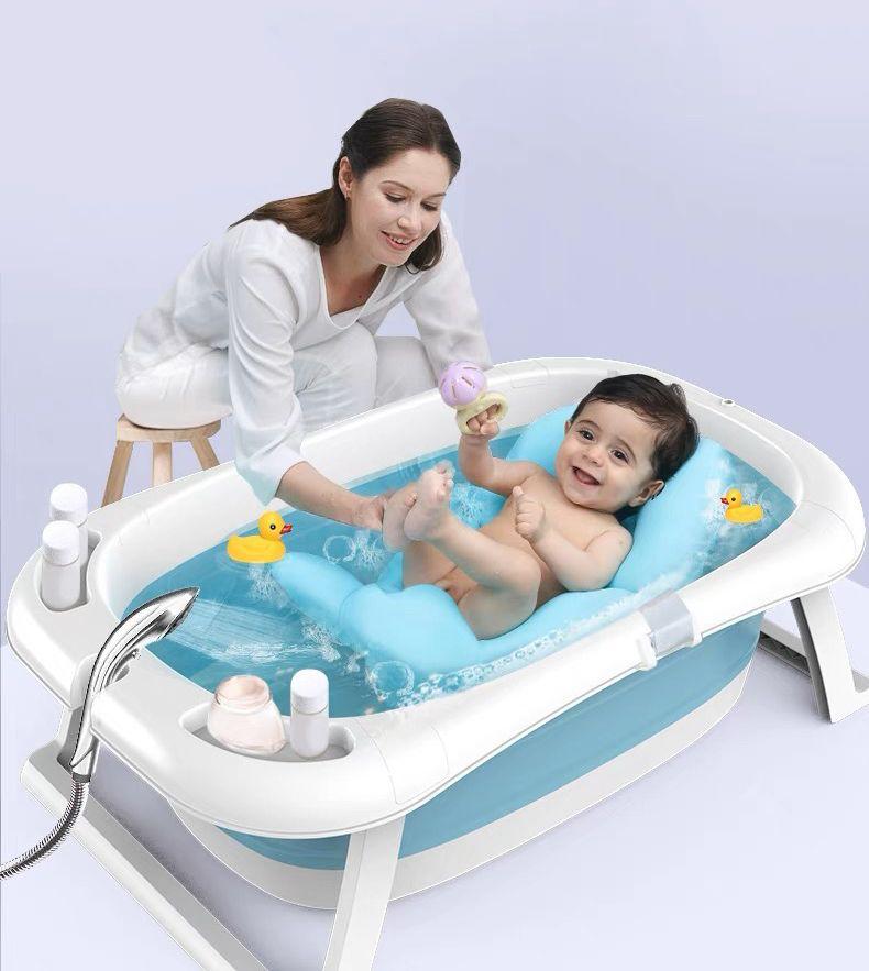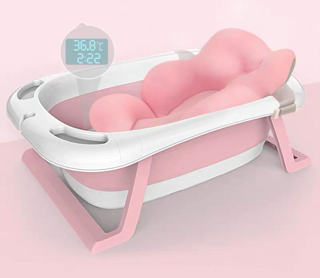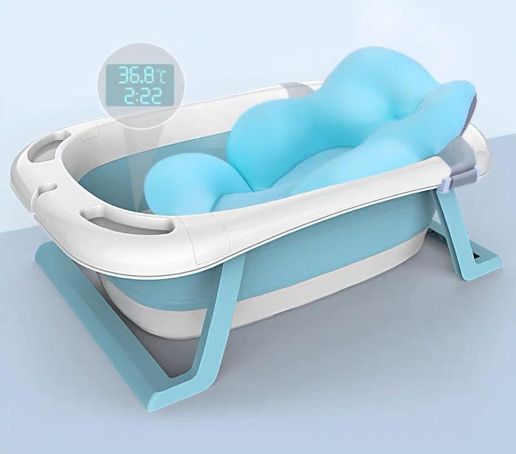 - Összecsukható babafürdő anatómiai támasztékkal és hőmérővel